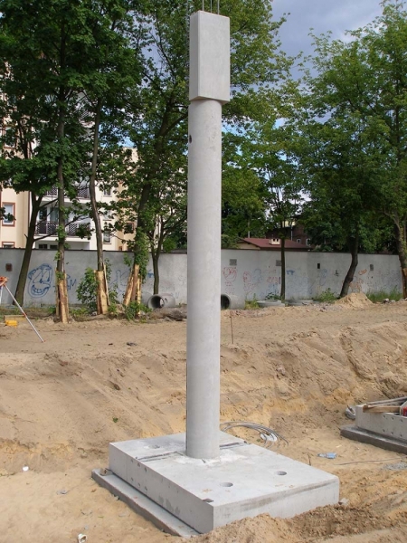 Runde Stützen mit angeformten Fundamenten sind besondere runde Stützen, die mit einem Einzelfundament gemeinsam gegossen und gefertigt werden. So eine konstruktive Lösung vereinfacht die Montage vor Ort auf der Baustelle wesentlich. Bei uns sind runde Stützen mit angeformten Fundamenten mit erheblichen Höhen bis zu einigen Geschossen erhältlich. Diese Stützen mit angeformten Fundamenten können mit entsprechenden Konsolen und weiteren Zubehörteilen für die Montage von Geschoss- und Dachträgern, Wänden versehen werden