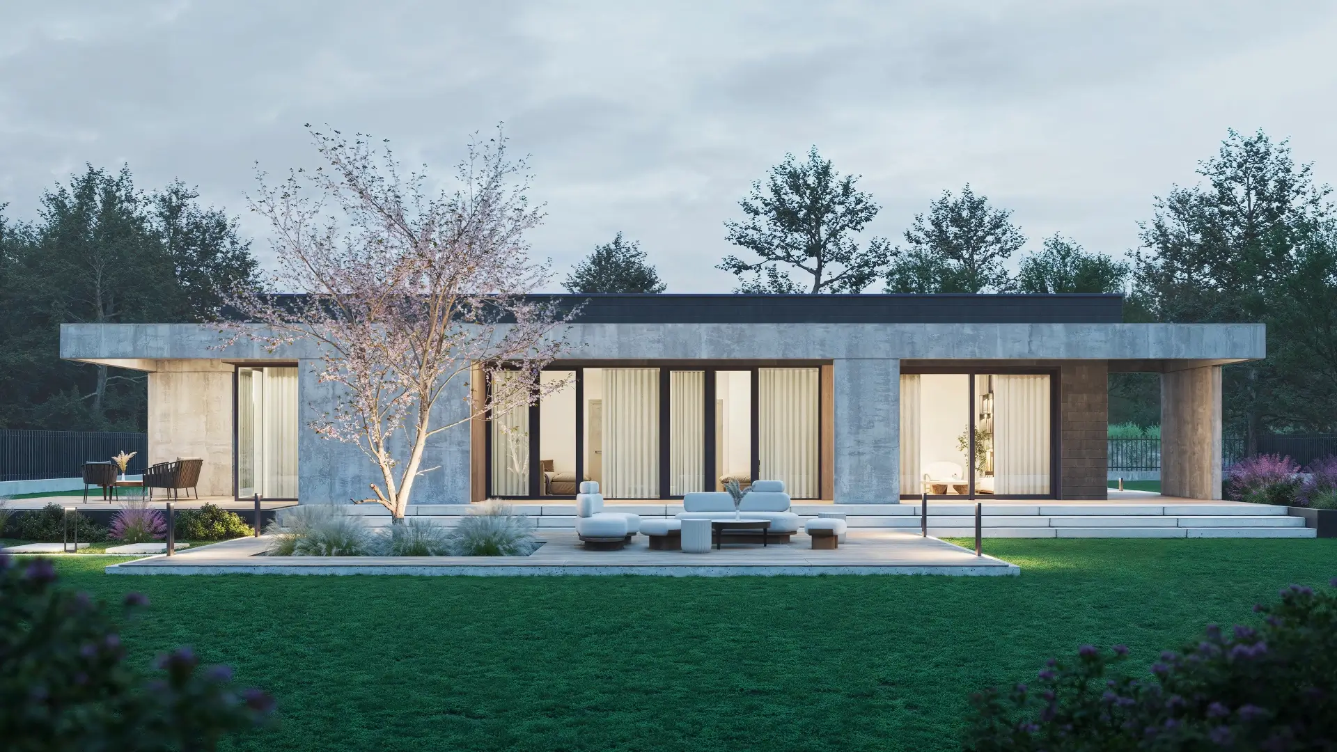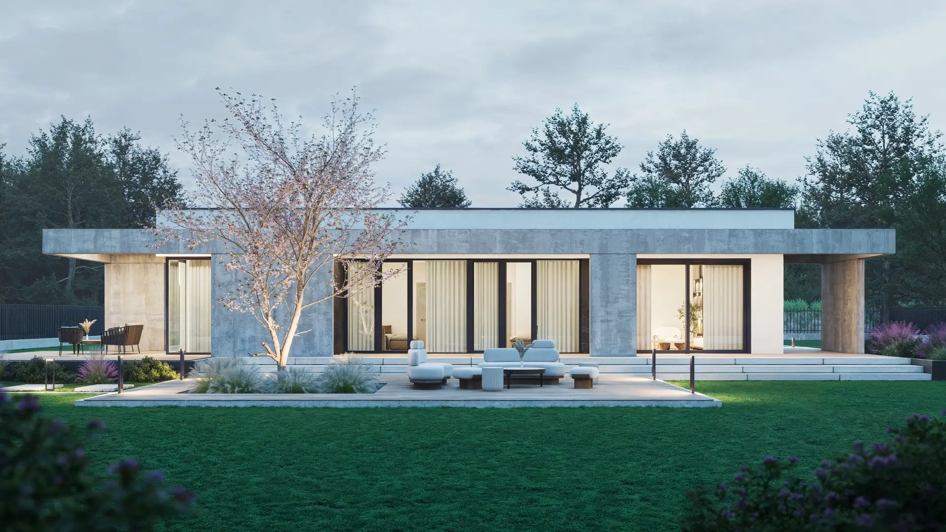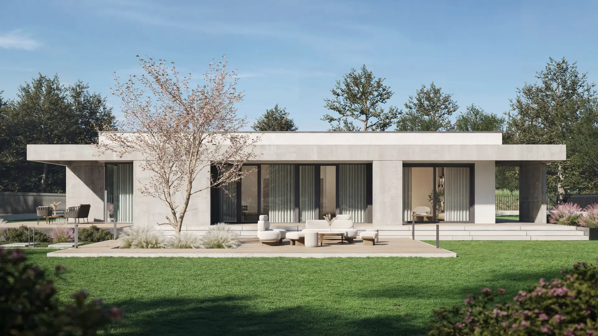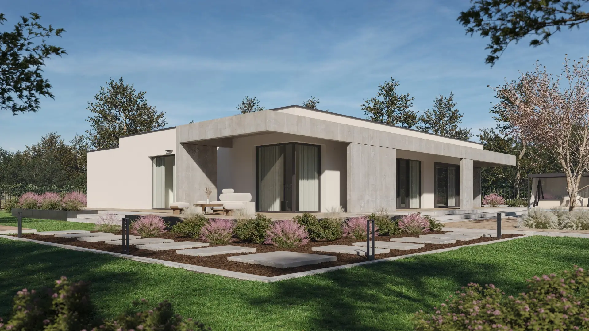 Ten dom o powierzchni 187 m² zaprasza do wnętrza pełnego światła, z dużymi przeszkleniami i otwartym salonem (ponad 31 m²), w którym architektura naturalnie łączy się z ogrodem.