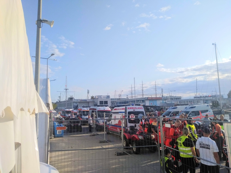 Godzina 3:20 dzwoni budzik. Oczy otwierają się z trudem i wcale nie mam ochoty się podnosić. Po kilku minutach walki wstaję, biorę prysznic i idę do kuchni. Śniadanie to ważna rzecz! Trzeba jeszcze zrobić jakieś jedzenie na cały dzień. Godzina 4.30 wsiadamy w auto i jedziemy do Gdyni. Ulice są puste. Cała Gdynia już zamknięta, wszędzie barierki, taśmy i służby porządkowe. Co chwilę zatrzymują nas, ale kiedy podchodzą do auta i widzą ubrania w kolorze wściekłej pomarańczy jesteśmy przepuszczani. Jedziemy prywatnym autem, bo naszym zadaniem na dziś jest główny punkt medyczny. Jest godzina 5.10 dojeżdżamy na miejsce po drodze kupując kawę na stacji. Na godzinę 5.30 wyznaczona jest odprawa. Karetki powoli zjeżdżają na plac w marinie w Gdyni, gdzie mamy swój punkt zbiórki. Na placu robi się tłoczno.