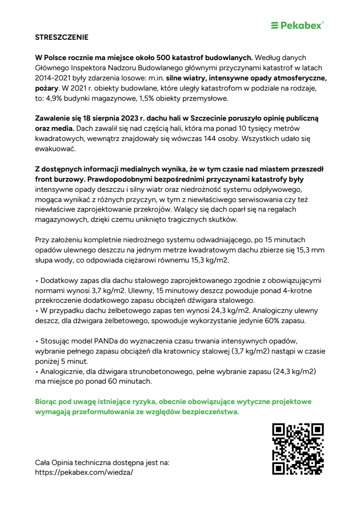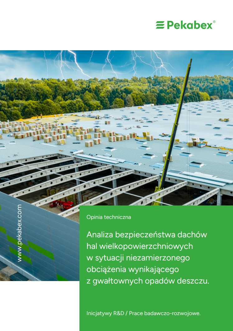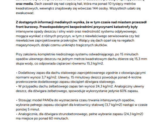 • „Opinia techniczna: Analiza bezpieczeństwa dachów hal wielkopowierzchniowych w sytuacji niezamierzonego obciążenia wynikającego z gwałtownych opadów deszczu”