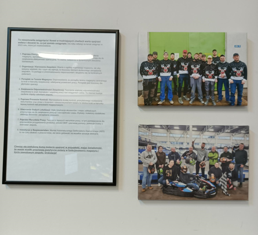 Wspólny wypad integracyjny na gokarty skłonił mnie do refleksji nad mijającym rokiem w Pekabeksie. Zainspirowany zespołowym zdjęciem postanowiłem podsumować ten okres.  Postanowiłem zasięgnąć opinii pracowników. Przygotowałem listę pytań, w tym oceny pracy własnej, zadane w ramach postanowień noworocznych. Jednak najbardziej interesujące dla mnie było pytanie:  „Z czego w swojej pracy byłeś/aś dumny/a w 2023 roku?”.  Zebrałem różnorodne odpowiedzi, a następnie umieściłem je w ozdobnych ramkach, wywieszając w miejscach często odwiedzanych przez pracowników. Chciałem, aby w trudnych chwilach, gdy pojawiają się wątpliwości, wszyscy mogli spojrzeć na nasze dotychczasowe osiągnięcia.