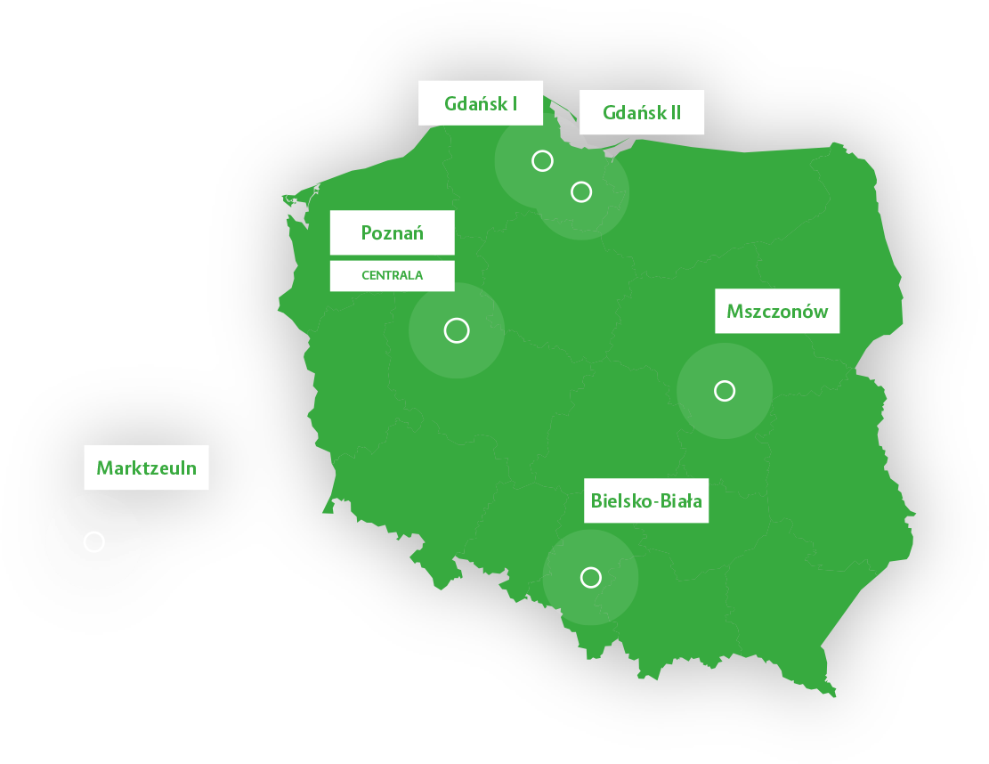 Produkcja elementów prefabrykowanych odbywa się w 6 zakładach. Ich strategiczna lokalizacja umożliwia efektywną logistykę produktów nie tylko w Polsce, lecz także za granicą: głównie na terenie Niemiec, Danii oraz Szwecji. Łączne moce produkcyjne wszystkich naszych fabryk na poziomie około 300 tys. m3 rocznie dają ogromne możliwości i pozwalają realizować największe projekty w regionie.