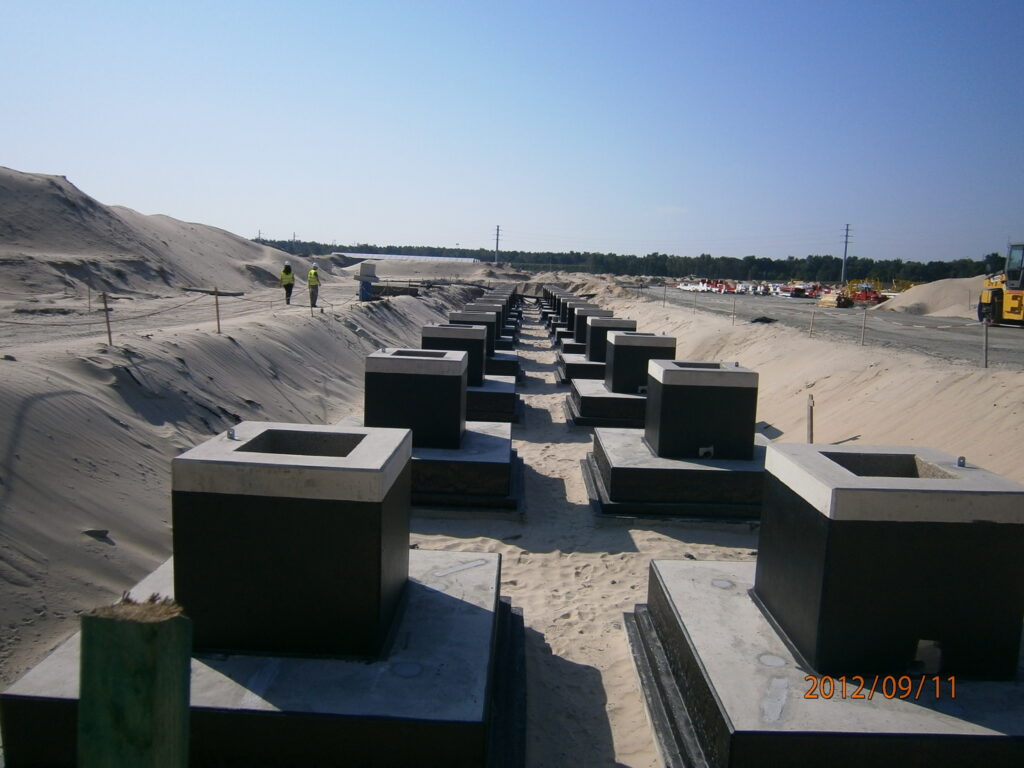 Prefabrykowane stopy fundamentowe przekazują obciążenia z konstrukcji na podłoże gruntowe. Są to gotowe elementy, które dostarczamy na miejsce realizacji inwestycji. To innowacyjne rozwiązanie stosowane w nowoczesnym budownictwie, które znacznie upraszcza i przyspiesza proces budowy fundamentów. Wykonane z betonu żelbetowego, prefabrykowane stopy fundamentowe są projektowane w oparciu o indywidualny projekt, aby spełniać konkretne wymagania konstrukcyjne i zapewniać solidne wsparcie dla budynków. Są one wykorzystywane zarówno w konstrukcjach hali przemysłowych, jak i budynkach mieszkaniowych, zapewniając solidne i trwałe podparcie dla różnego typu budynku.